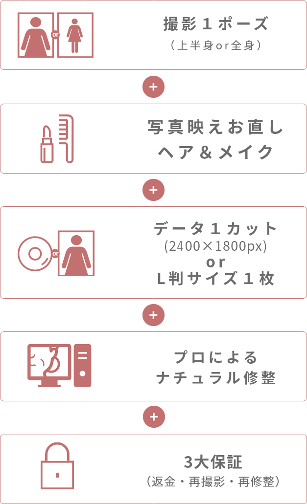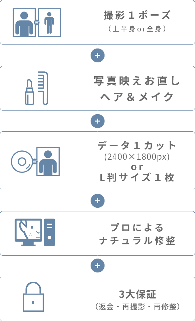 撮影・ヘアメイク・データ・修整・3大保証がついたフォトプラン。AIとタッグを組み、スタジオ写真とは雰囲気を変えたあなただけの背景をご用意!スナップ(屋外)撮影をしなくても、屋外以上のクオリティを実現。